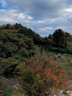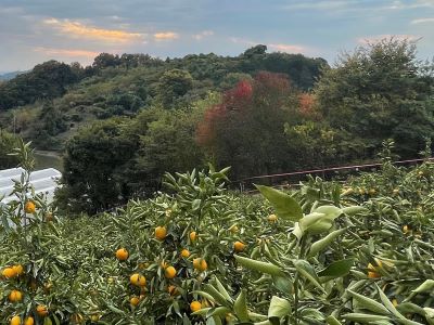 みかん山での作業は斜面の昇降だけでも大変ですが、山の上からこんな景色が見られます。初秋、そろそろ木々が色着いてきています。雲も秋っぽい。